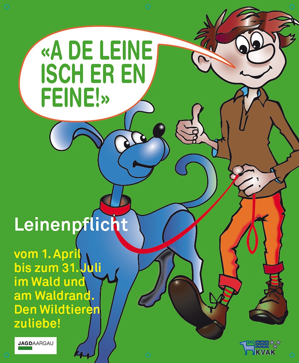 Von Eva Witschi, KVAK-Vorstandsmitglied, gestaltete Hinweistafeln und Flyer werden derzeit an alle Jagdgesellschaften und KVAK-Vereine abgegeben. Diese Zusammenarbeit unterstreicht das besondere Verhältnis zwischen Kynologen und Jägern im Aargau. Die Kampagne «a de Leine isch er en feine» will in erster Linie aufklären. Allerdings müssen fehlbare Hundehalter Verzeigungen gewärtigen.